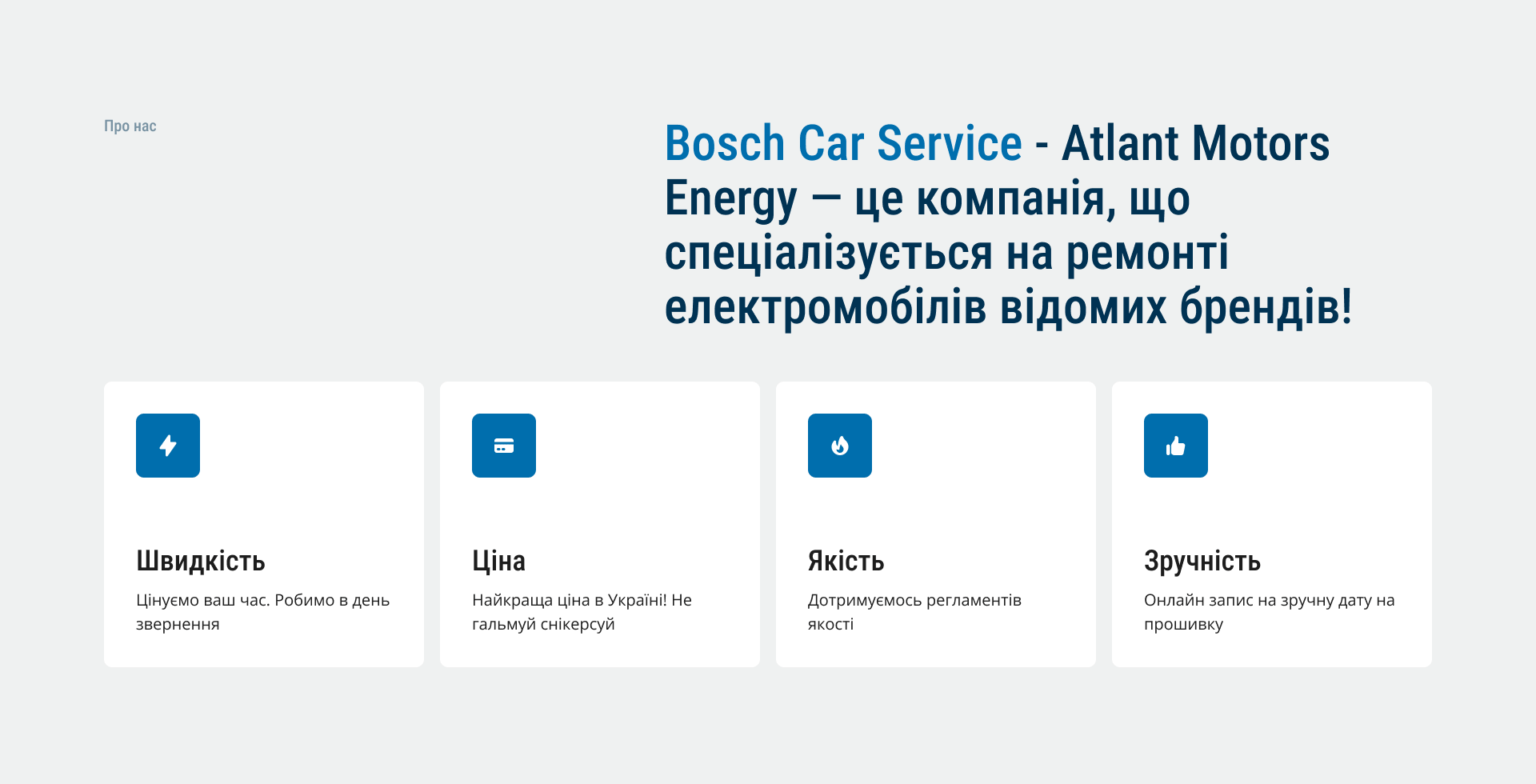 We designed and developed a sleek landing page for the Bosch Car Service - Atlant Motors Energy project, focusing on a clean, modern aesthetic and responsive performance. Built from scratch, the site highlights key features effectively and ensures seamless navigation, delivering an engaging experience for users.