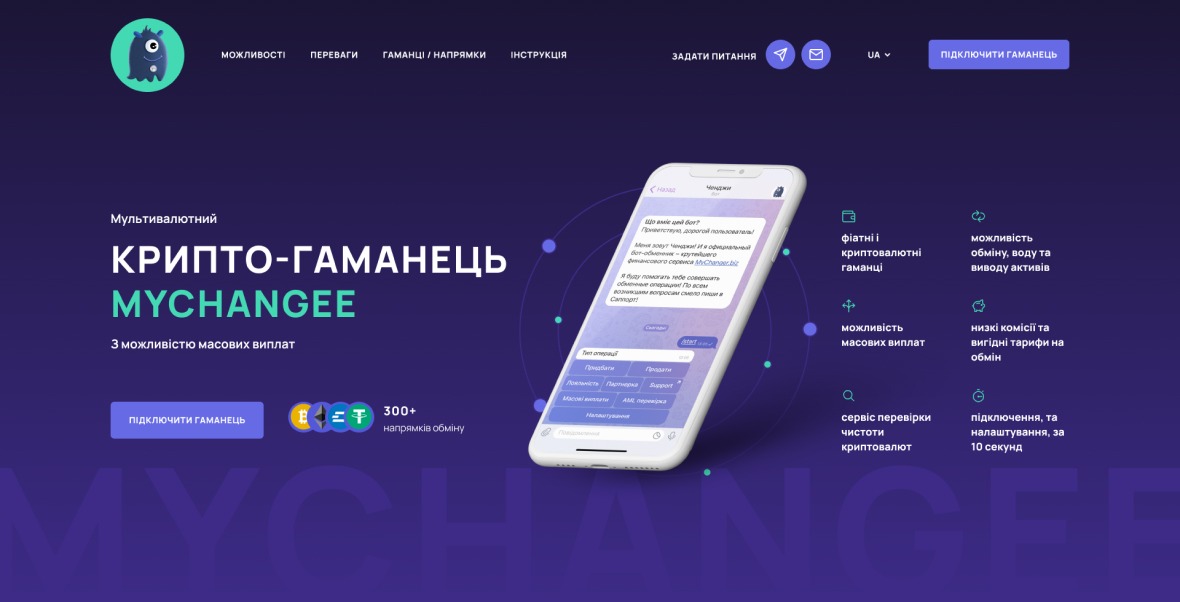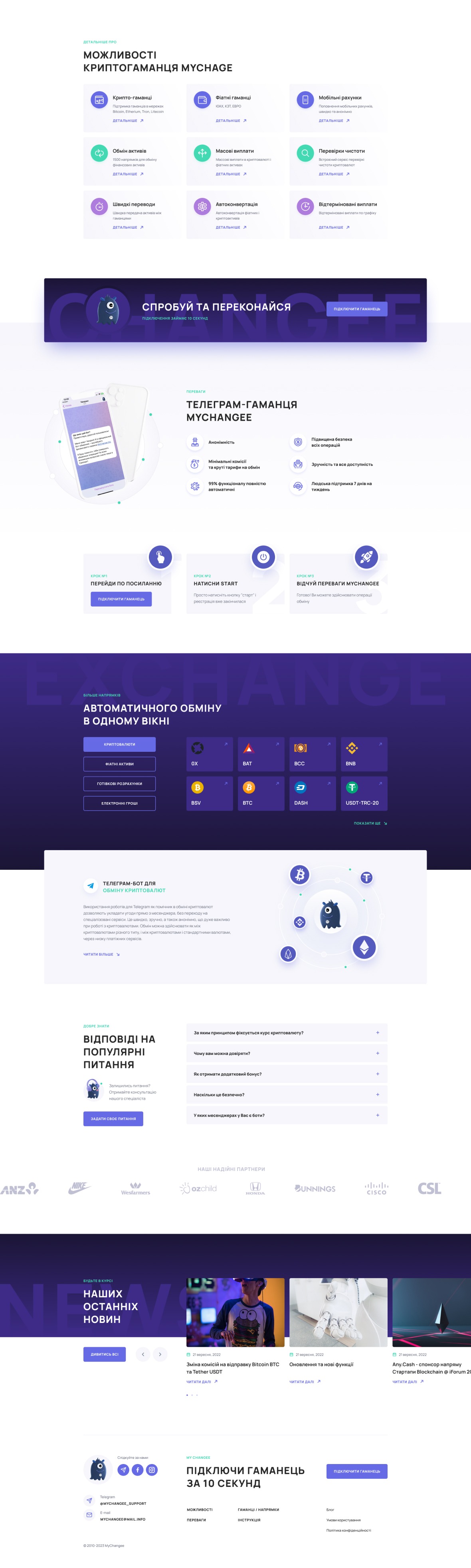 MyChangee is a multi-currency telegram crypto wallet bot with a large number of functions. The customer needed a website that would tell about all its directions, advantages and an accessible explanation of its use. The style of the site was chosen in accordance with the crypto theme